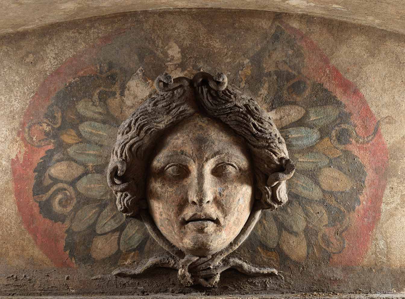 Ogni ipogeo si compone di una camera superiore destinata ai riti funebri e una inferiore dove erano sepolti i corpi, adagiati su letti dipinti con colori vivaci come rosso, azzurro e giallo. L’ipogeo meglio conservato mostra un ingresso monumentale con colonne e un soffitto decorato con fregi ionici e motivi figurati (grifoni, fiori, volti umani). Nella camera inferiore spicca un rilievo di Medusa e affreschi che rappresentano un ricco corredo funerario, con scene di Dioniso e Arianna, simboli legati alla rinascita e al mistero della vita e della morte.